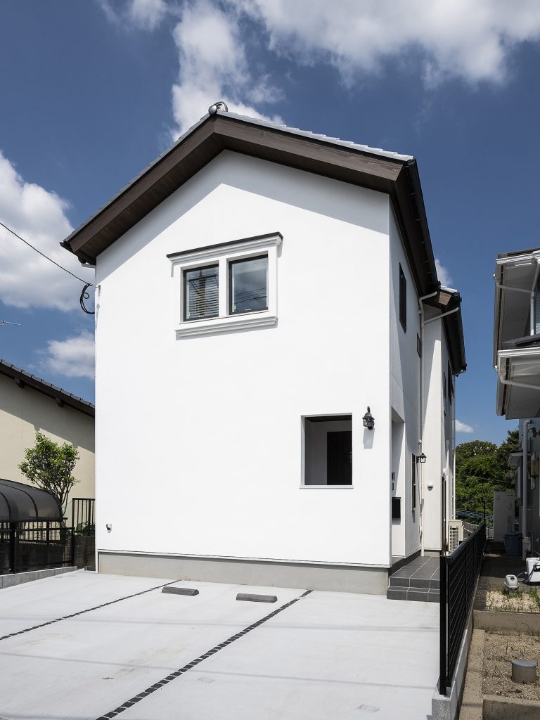 白壁の塀とのバランスが良いように、古民家風の家を新築で建てることに。[ハウスランド社さんは古民家のリノベーションを得意とされているので、白壁にマッチする家を建ててくれると思っていました」。