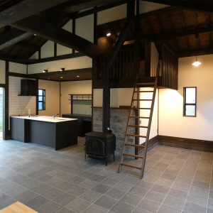 玄関には施主のお気に入りの蔵戸を採用し、土間には薪ストーブとキッチンを配置し、屋根裏表しの大空間には逞しい太鼓梁を渡し、古民家のような空間を目指しました。