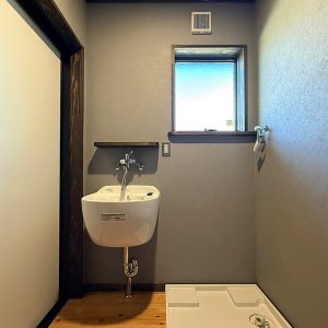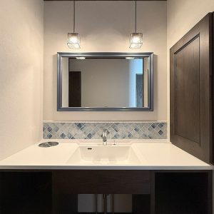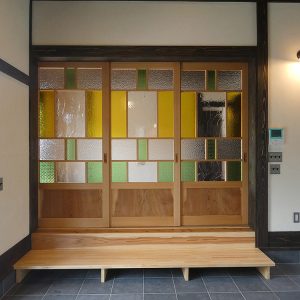 造作のカップボードと洗面台それに色ガラス入りの建具は、当社オリジナルでオシャレな空間になりました。