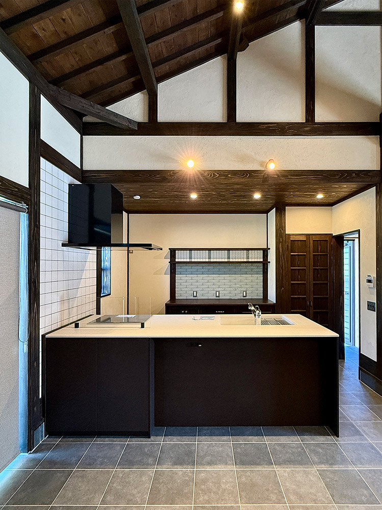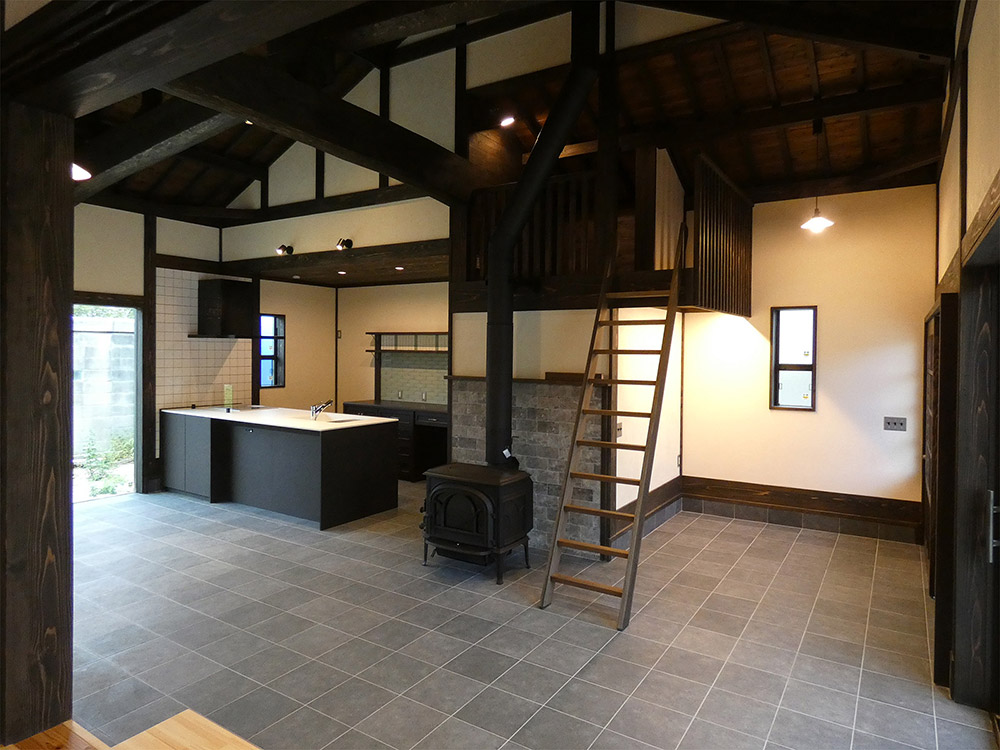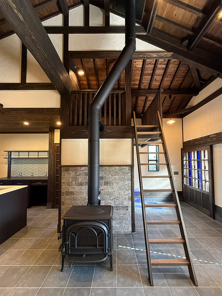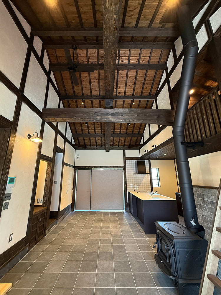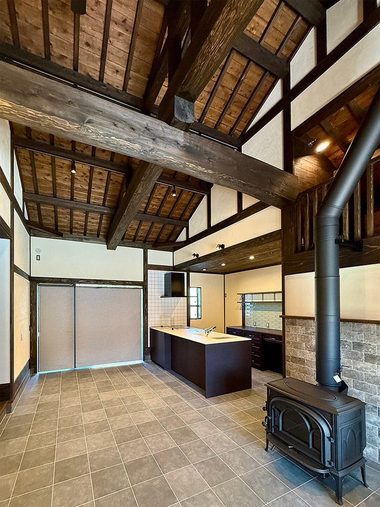 玄関には施主のお気に入りの蔵戸を採用し、土間には薪ストーブとキッチンを配置し、屋根裏表しの大空間には逞しい太鼓梁を渡し、古民家のような空間を目指しました。