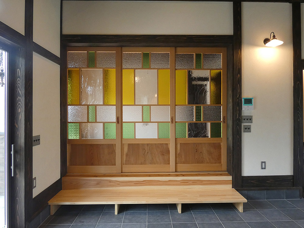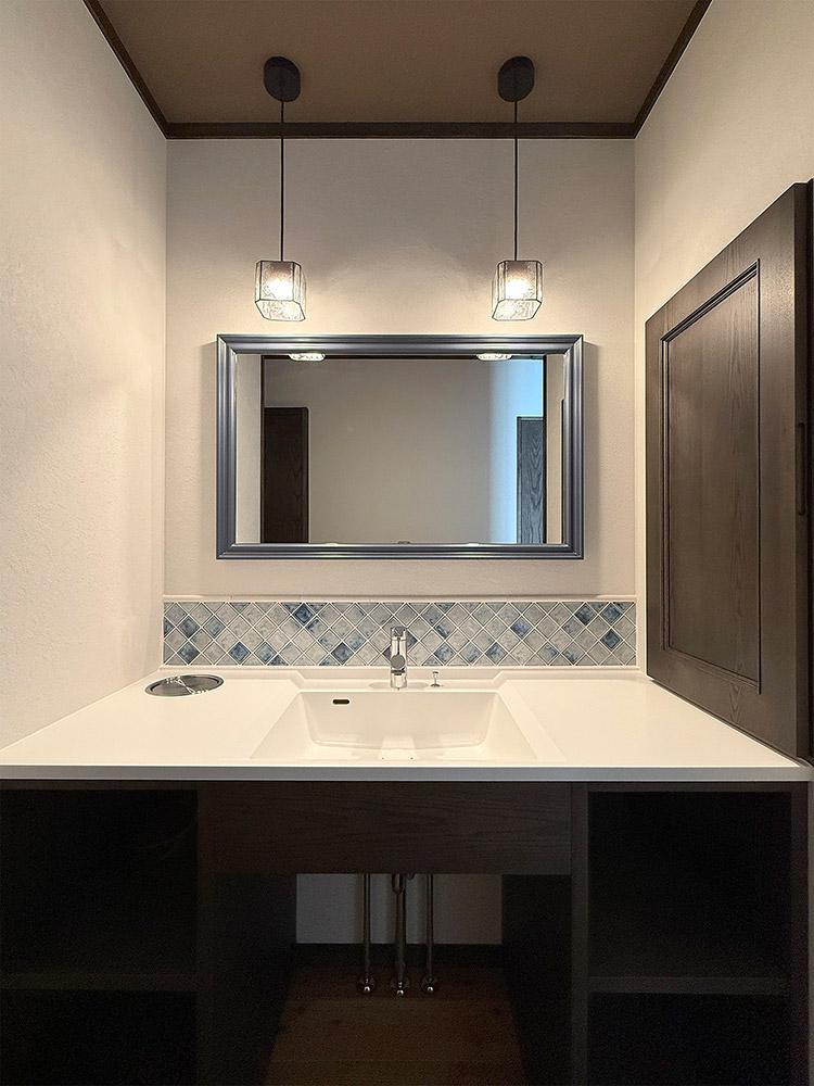 造作のカップボードと洗面台それに色ガラス入りの建具は、当社オリジナルでオシャレな空間になりました。
